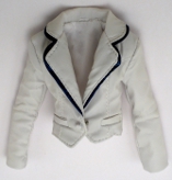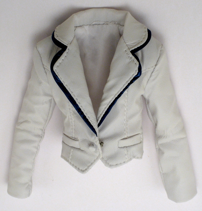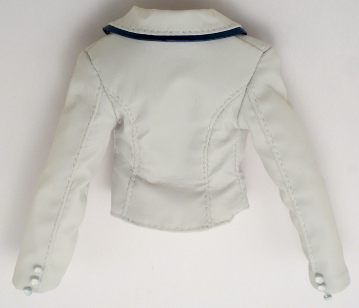 Jacket: Tuxedo style, white faux leather, lined in white satin, has Jem tag. 3 buttons on each cuff and two small ornamental pockets in front; non functional button in front. Closes with a hook and eye closure. Lapels are lined in the same blue material of her pants. (Back of Jacket) |