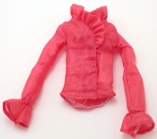 Blouse: sheer stiff polyester with ruffled neckline, belled sleeves, two hook and eye closures in front. Tagged. |