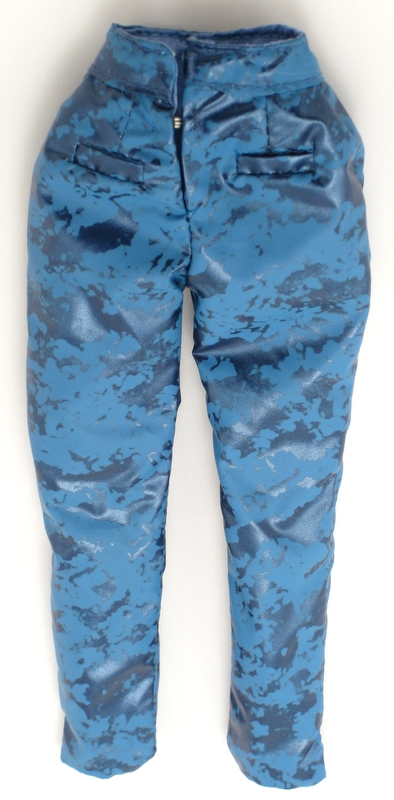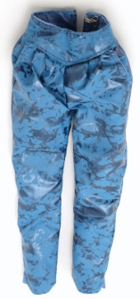 ![]() | Pants: harem style shiny nylon with matte lighter blue design printed, lined in blue satin material. Tagged. Has one hook and eye closure in back, pockets in front and back. |