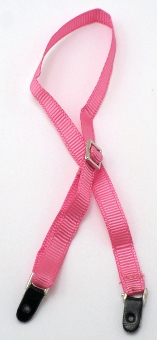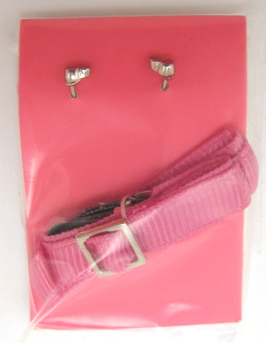 Guitar strap: hot pink ribbon with silver buckle, faux leather fasteners on ends. It came attached to a pink piece of cardboard with the earrings in a little baggie. |