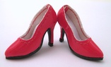 shoes: hot pink leatherette pumps, white interior, black soles. |