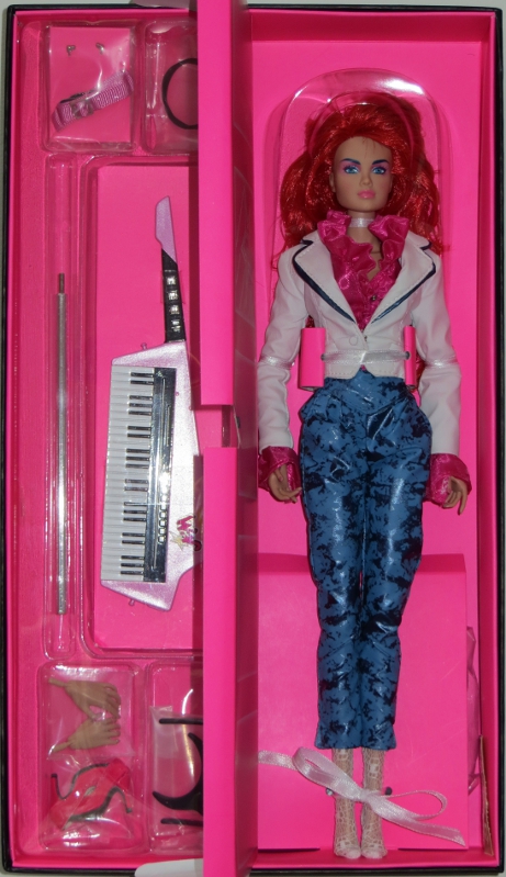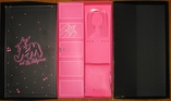 The box cover lifted off to reveal the doll inside - she is tied in with white ribbons and has a clear acetate bonnet to hold her hair in place. The knees are protected/held in place with clear vinyl. To the left of the doll is a thin cardboard "door" with the doll's name on it, which opens to reveal the accessory tray. Some parts are in plastic baggies or attached to a pink piece of cardboard. The stand base is behind her calves in a separate compartment. Behind the inner tray that holds both the doll and "locker" part is where the COA and instructions can be found. |