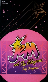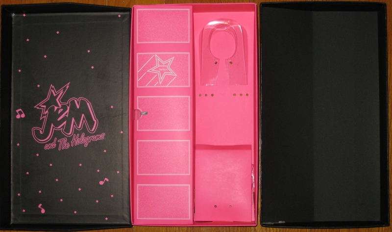 The inside of the top cover is black and has has a bright Jem logo & confetti/music notes design printed on the inside. The inner part of the back of the box is undecorated black. The doll display area is hot pink. |