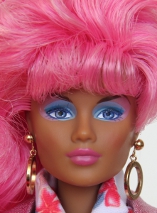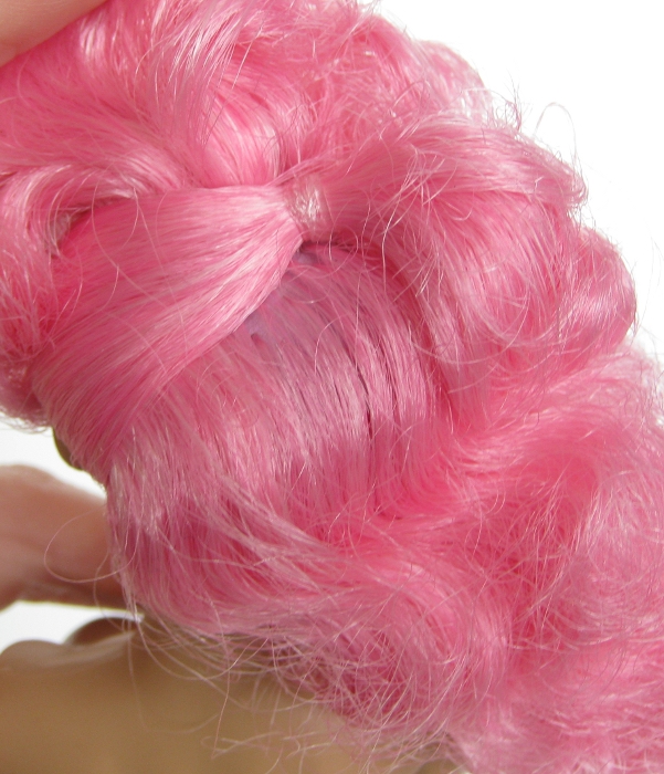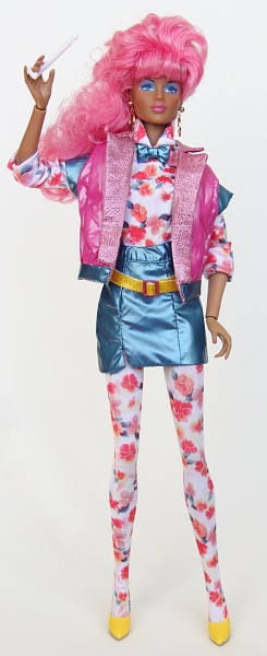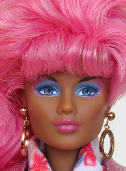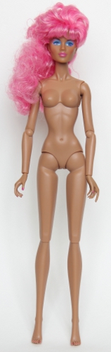 12 inch (30.5 cm) Articulated fashion doll: Warm brown ("Latino" skintone, in Integrity terms) complexion; curly bright pink hair, styled with an elastic band