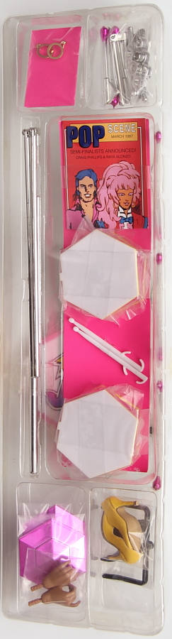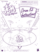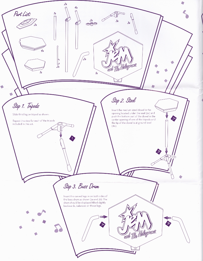 accessories Made up of pieces itemized below. These were placed in a clear plastic tray concealed behind the pink cardboard name door/wall that she is displayed beside in the box, not visible until the package is opened completely. Most of her accessories are for her impressive drum kit which requires some assembly. See a photo of it put together. |