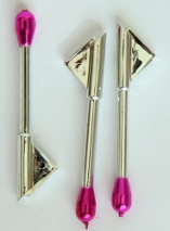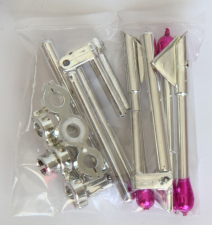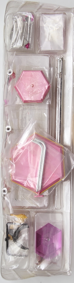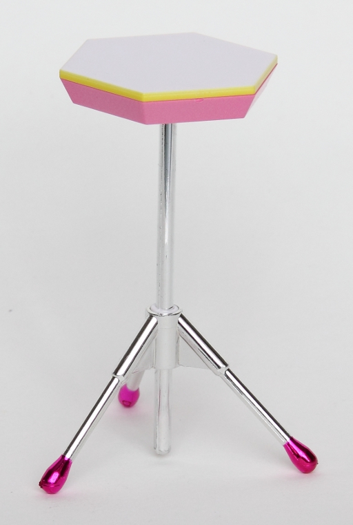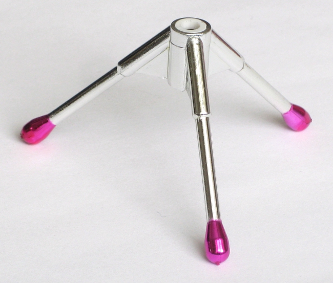 ![]() | tripod double legs (3): Chromed plastic with hot pink accents. Came in separate baggies. These require the single legs (shown below) added to them to stand up. Completed tripod. Two are used for the drum towers; one is used for the seat. |