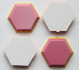 ![]() | Tom Toms (4): Came attached to a large piece of pink card stock with the drum sticks & magazine. Pearlized pink, yellow and shiny white plastic. Photo of a completed drum tower (there are enough parts to make two of these)
