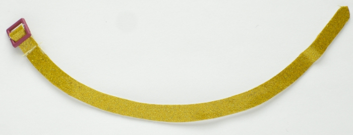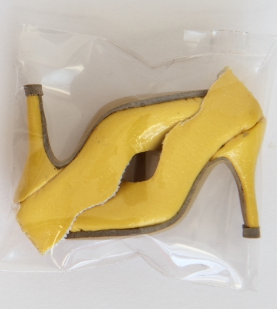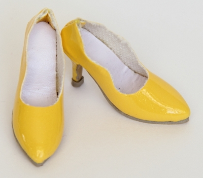 shoes: Yellow leatherette with white insoles, tan soles; has a subtle glittery sheen. Have a scalloped edge. Came in a baggie in the accessories tray.