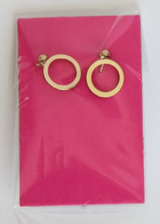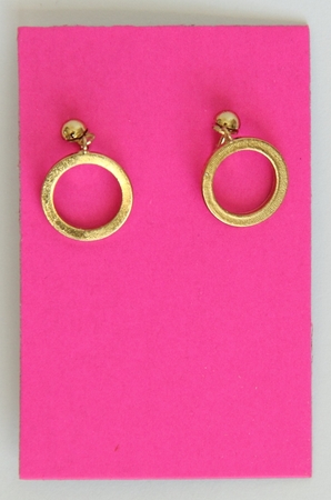 ![]() | Earrings: Gold tone metal, dangling hoops. Came in a baggie on a pink piece of cardboard.