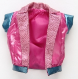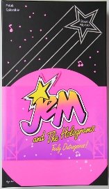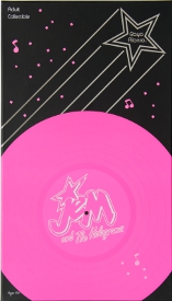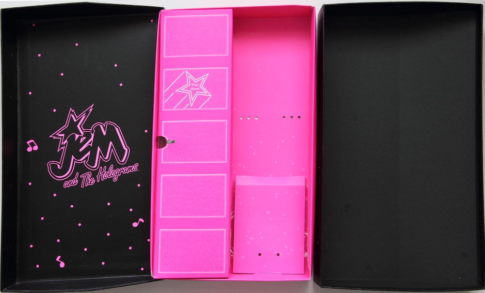 The inside of the top cover is black and has has a bright Jem logo & confetti/music notes design printed on the inside. The inner part of the back of the box is undecorated black. The doll display area is hot pink. |