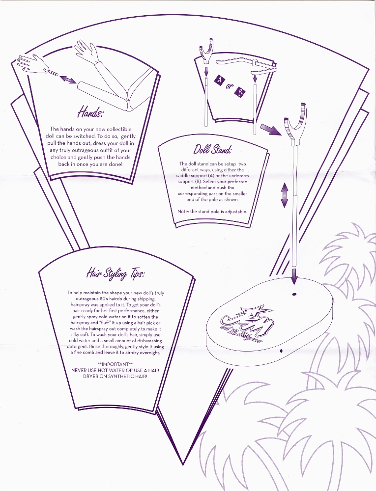 The box cover lifted off to reveal the doll inside - she is tied in with white ribbons and has a hair net to hold her hair in place. The knees are protected/held in place with clear vinyl. To the left of the doll is a thin cardboard "door" with the doll's name on it, which opens to reveal the accessory tray. Some parts are in plastic baggies or attached to a pink piece of cardboard. The stand base is behind her calves in a separate compartment. Behind the inner tray that holds both the doll and "locker" part is where the COA and instructions can be found. |