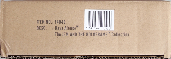 Shipper: A plain cardboard box with some printing on the bottom reading ITEM NO.: 14046/DESC.: Raya Alonso TM/The JEM AND THE HOLOGRAMSTM Collection. The doll box was wrapped in clear cellophane bag. |