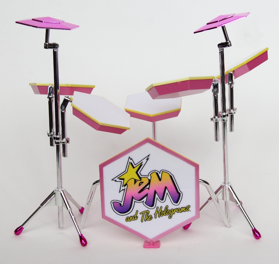 Bass drum: pearlized pink, yellow and shiny white plastic with a Jem logo label applied to the front. Was in a baggie with two metal legs, taped to the back of the tray. A photo of the assembled bass drum.