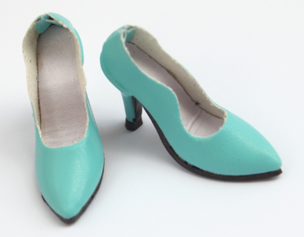 shoes: Pale aqua scallop edged pumps with white insoles, black soles. |