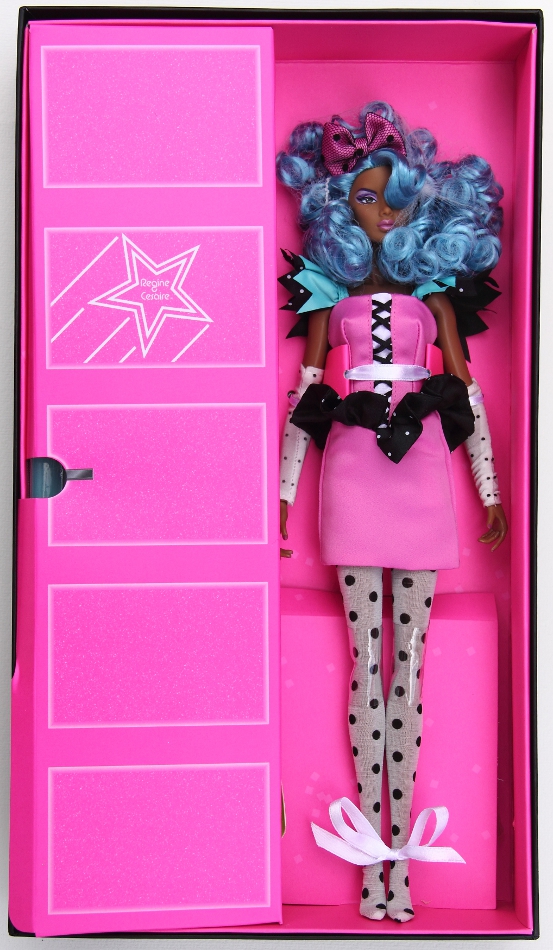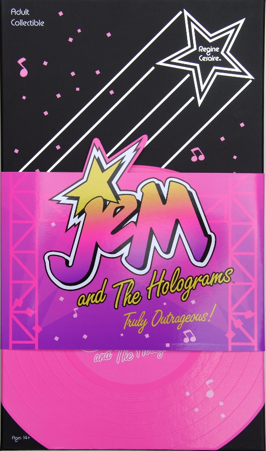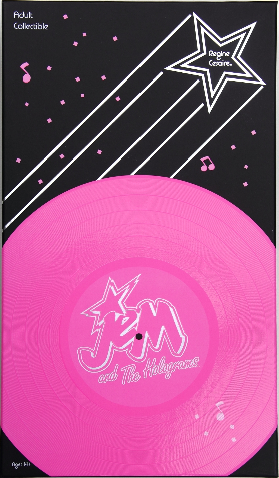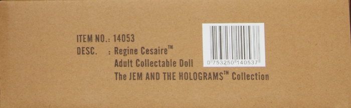 Shipper: A plain cardboard box (nearly double the size of the single-doll boxes) with some printing on the bottom reading ITEM NO.: 14053/DESC.:Regine CesaireTM/Adult Collectable Doll/The JEM AND THE HOLOGRAMSTM Collection. The dolls' box was wrapped in clear cellophane bag. |