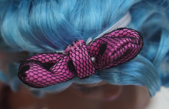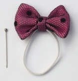 ![]() | Hairbow: pink bow with a layer of black polka dot net on an elastic band. It is secured in place with a straight pin. |