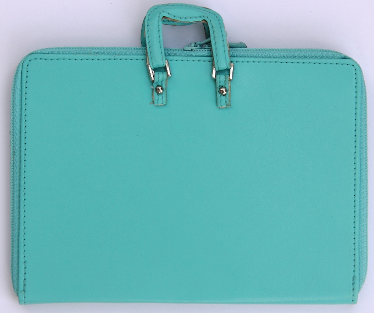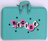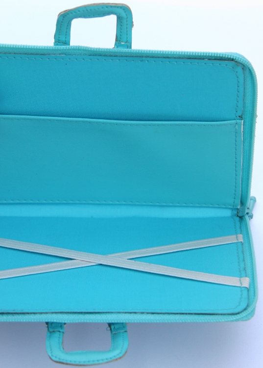 is screened with white, black and pink lettering and designs. Inside there is a criss cross of white elastic and a small pocket to hold her designs. The back is blank. It came in a plastic bag, taped to the back of her accessories tray. |
