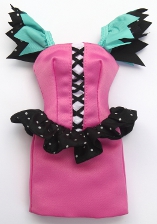 Pink mini dress with a peplum made of black material with white polka dots; the front has a black and white corseted panel; shoulders are decorated with double layered, short jagged sleeves. Fastens in back with hook and eye closures. |