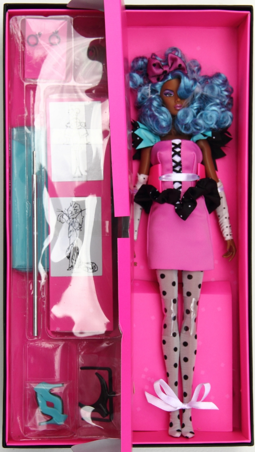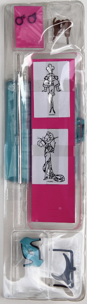 The box cover lifted off to reveal the doll inside - she is tied in with white ribbons and has a hair net to hold her hair in place. The knees are protected/held in place with clear vinyl. To the left of the doll is a thin cardboard "door" with the doll's name on it, which opens to reveal the accessory tray. Some parts are in plastic baggies or attached to a pink piece of cardboard. The stand base is behind her calves in a separate compartment. Behind the inner tray that holds both the doll and "locker" part is where the COA and instructions can be found. |