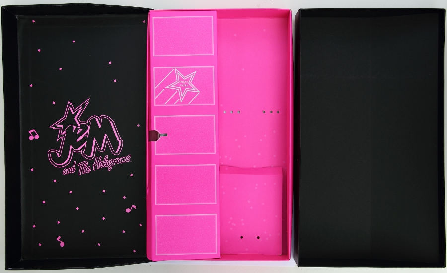 The inside of the top cover is black and has has a bright Jem logo & confetti/music notes design printed on the inside. The inner part of the back of the box is undecorated black. The doll display area is hot pink. |