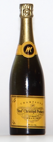 ![]() | Champagne bottle: Hollow clear greenish plastic Clicquot-style champagne bottle, nice nod to Jem's early days (stylized M) there on the neck label! Came attached to a long pink piece of cardboard with several other items in the accessory tray. |