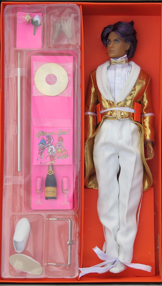 The box cover lifted off to reveal the doll inside - he is tied in with white ribbons. The knees are protected/held in place with clear vinyl (under pants). To the left of the doll is his accessories tray. Some parts are in plastic baggies or attached to a pink piece of cardboard. The stand base is behind his calves in a separate compartment. Behind the inner tray that holds both the doll and tray part is where the COA is found. The backdrop is orange, like Hasbro's Glitter 'n Gold Rio's back was orange, way back in 1986. |