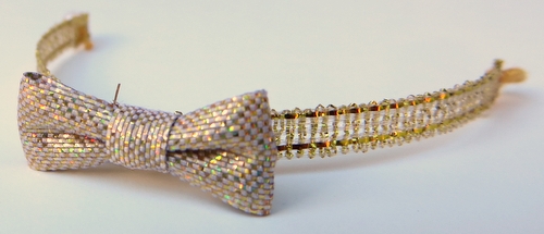![]() | bow tie: gold ribbon with holographic gold crepe bow tie attached (fabric matches Glitter 'n Gold Jem/Jerrica skirt), fastens in back with a yellow elastic loop that goes over a tiny pearl button. |
