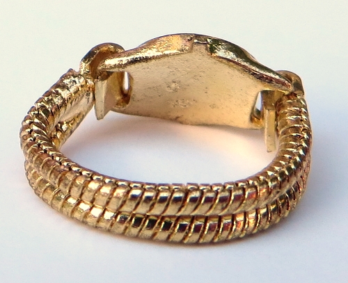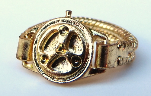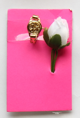 ![]() | watch: gold-coloured metal face, two thin metal cords that act as a watch strap. (see back). Came attached to a small pink piece of cardboard with the rose. |