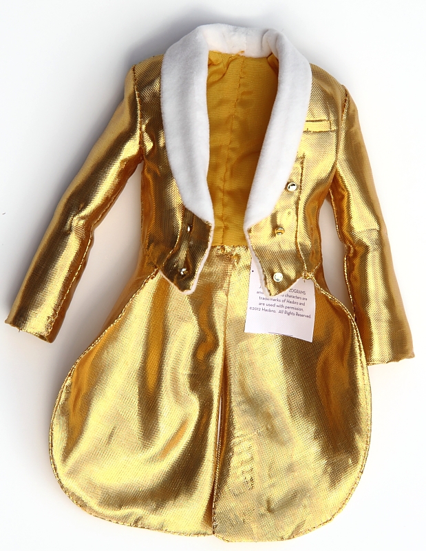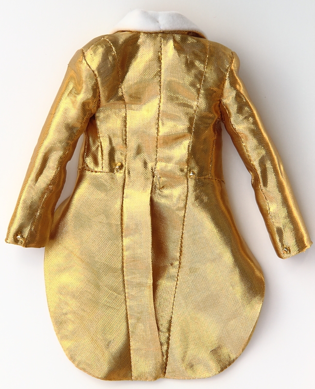 ![]() | Tuxedo Jacket: Tailed, very shiny woven gold fabric, jacket lined with dark yellow satiny material, white velveteen lapels, one breast pocket, 6 gold decorative buttons down front, two in back. It does not have a closure. (back) |