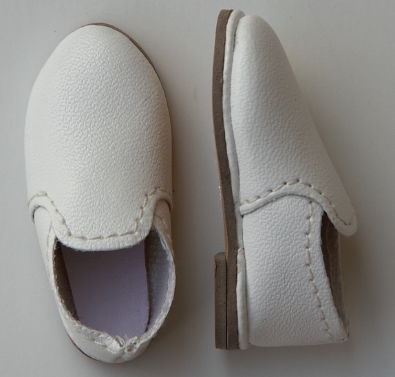 shoes: White leatherette loafers, beige soles with short heel. White leatherette insoles.