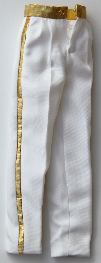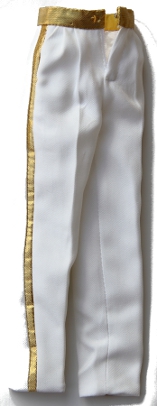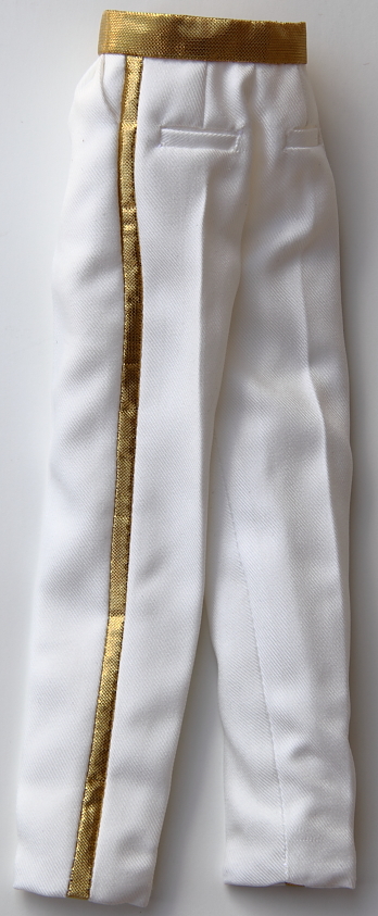 pants: White grosgrain, pleated in front, decorative "pockets" in back,