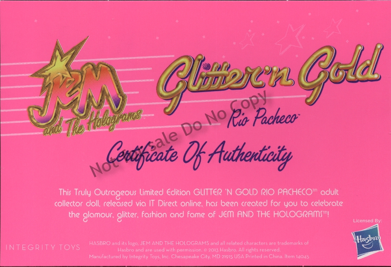 Shipper: A plain cardboard box with some printing on the bottom reading ITEM NO.: 14045/DESC.:Glitter'n Gold RIO PACHECOTM/The JEM AND THE HOLOGRAMSTM Collection/IT Direct 2013 Online Exclusive Adult Collectible Doll. The doll box inside was wrapped in clear cellophane bag. |