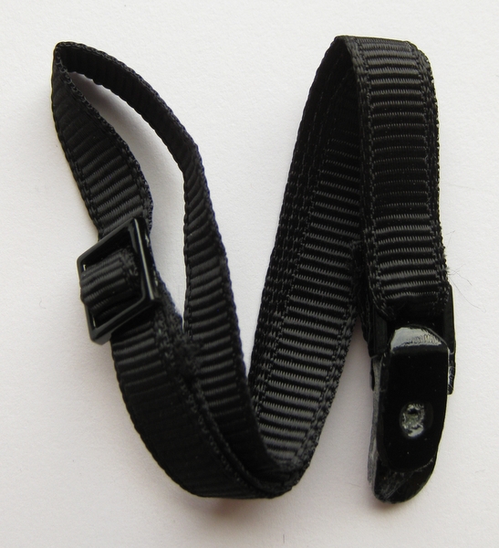 Guitar strap: Attached to a long piece of black cardboard with the guitar, album and mic. Black grosgrain ribbon with faux leatherette ends, black buckle.