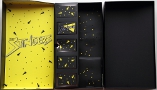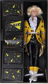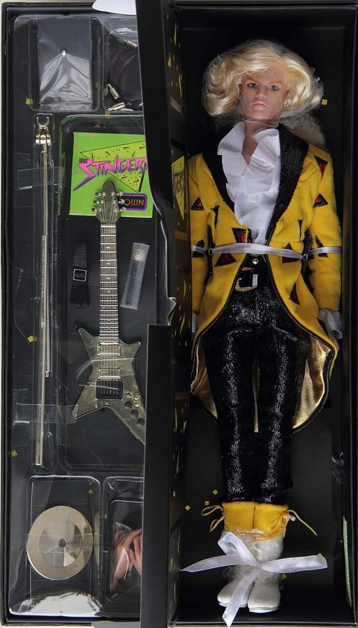 The box cover lifted off to reveal the doll inside - he is tied in with white ribbons and has a hair net over his head to hold his hair in place. The knees are protected/held in place with clear vinyl (under his pants, not visible). To the left of the doll is a thin cardboard "door" emblazoned with the Stingers logo, which opens to reveal the accessory tray. Some parts are in plastic baggies or attached to a black piece of cardboard. The stand base is behind his calves in a separate compartment. Behind the inner tray that holds both the doll and "locker" part is where the COA and instructions can be found. |
