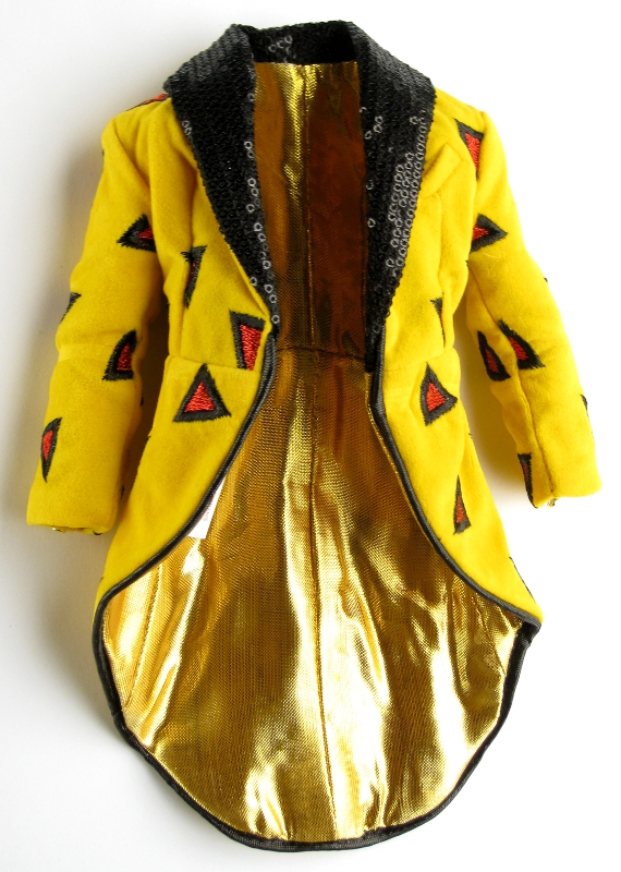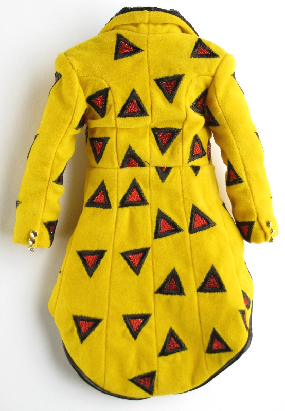 orange and black triangles, "gold" decorative buttons on cuffs, lined