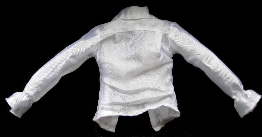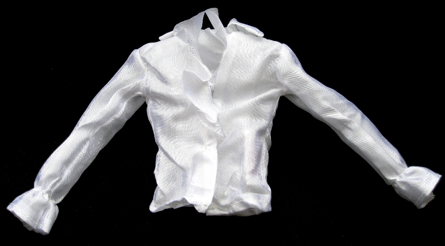 Shirt: Shimmery white shirt with elasticized ruffled cuffs; ruffled in front, single hook-and-eye closure in front. Tagged. (back) |