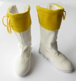 shoes: Soft white leatherette heeled boots with white soles; velveteen cuff with yellow lace, zipper closure in back. He was sold wearing them, his feet were bound together with clear plastic wrap. |