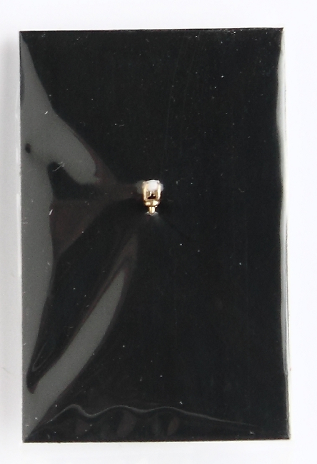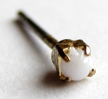 ![]() | Earring: Very small single white bead in a gold-tone setting. Came poked through a piece of black cardboard in a baggie. |