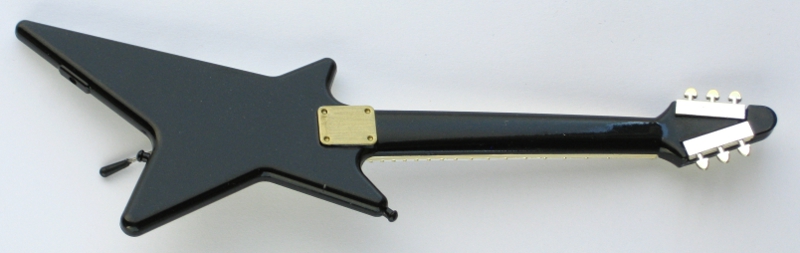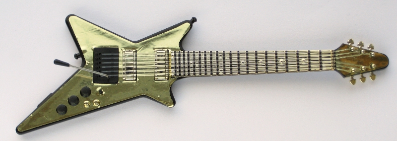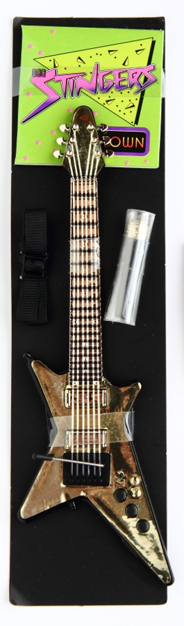 ![]() | Guitar: Plastic with gold mirror decal, has "real" plastic strings and whammy bar. Attached to a long piece of black cardboard with the guitar strap, album and mic. (back) |