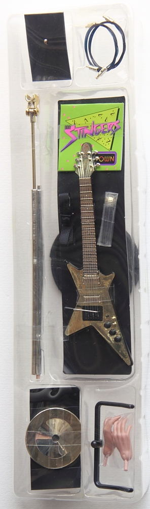 accessories Made up of pieces itemized below. These were placed in a clear plastic tray concealed behind the yellow cardboard "Stingers" door/wall that he is displayed beside in the box, not visible until the package is opened completely. |