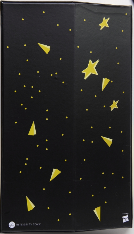 The inside of the top cover is yellow with the Stingers logo, decorated with a triangles/stars/confetti design. The inner part of the back of the box is undecorated black. The doll display area is repetition of the yellow triangles/stars/confetti design on a black field. |