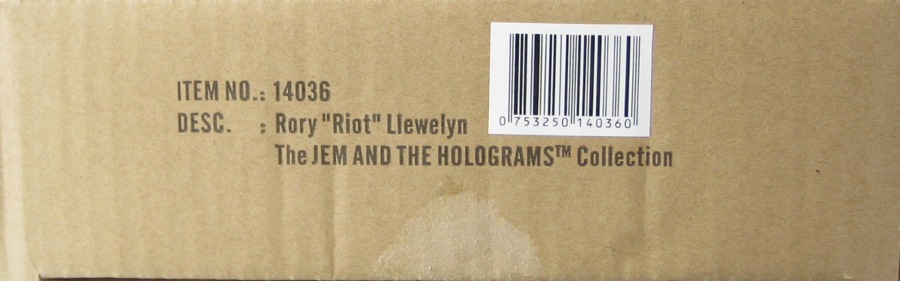 Shipper: A plain cardboard box with some printing on the bottom reading ITEM NO.: 14036/DESC.:Rory "Riot" Llewelyn/The JEM AND THE HOLOGRAMSTM Collection. The doll box was wrapped in clear cellophane bag. |