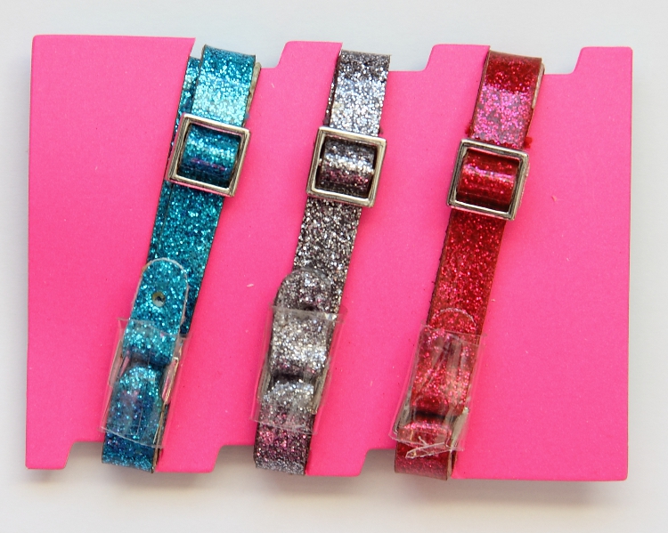 | Guitar Strap (black): Adjustable glittery black leatherette with chrome buckle. Came wrapped around a piece of black card stock.