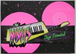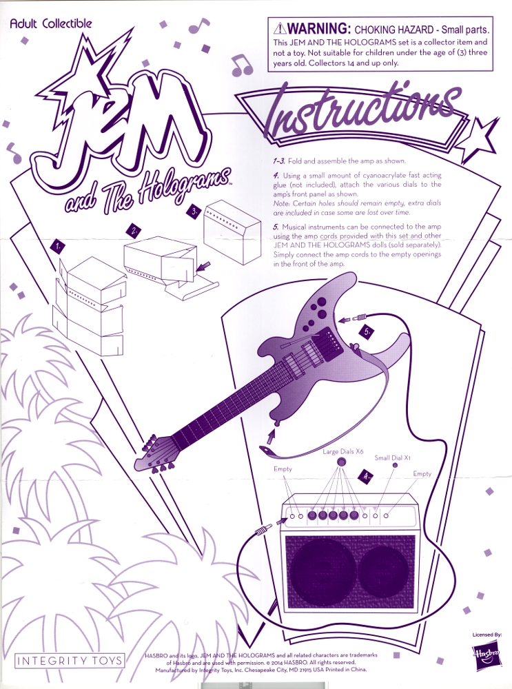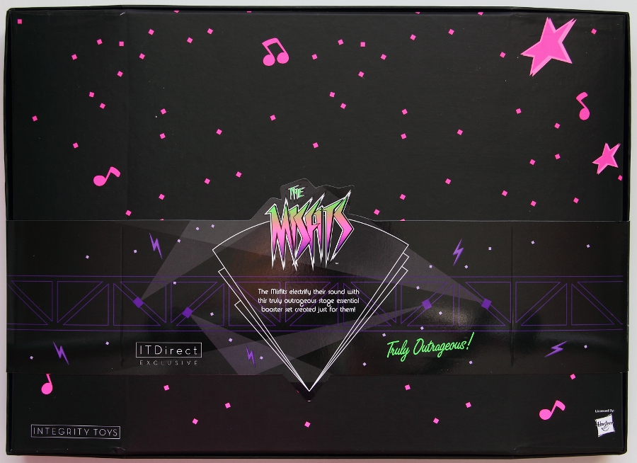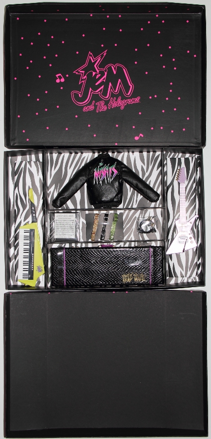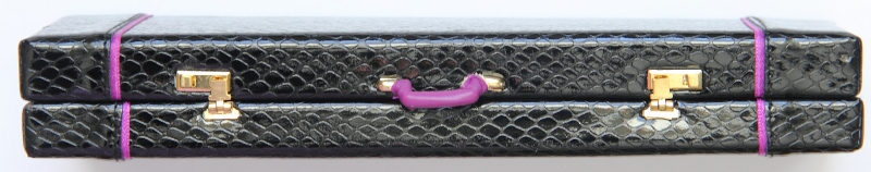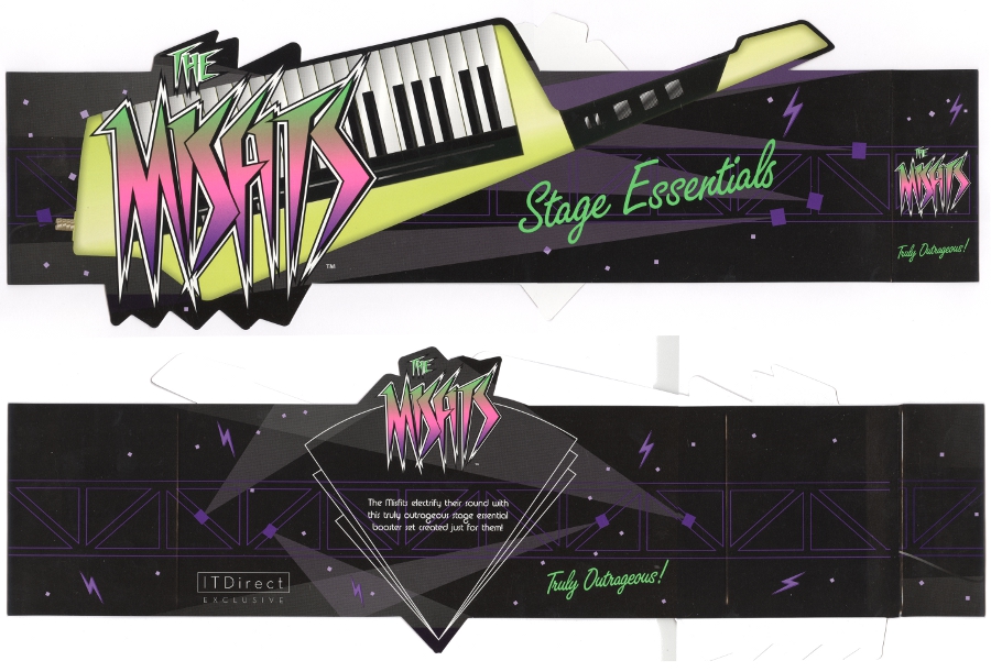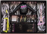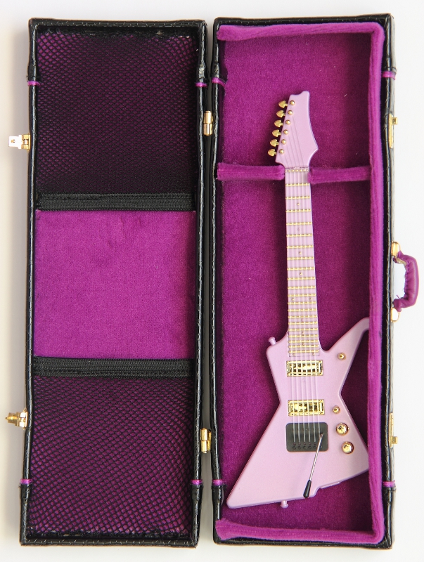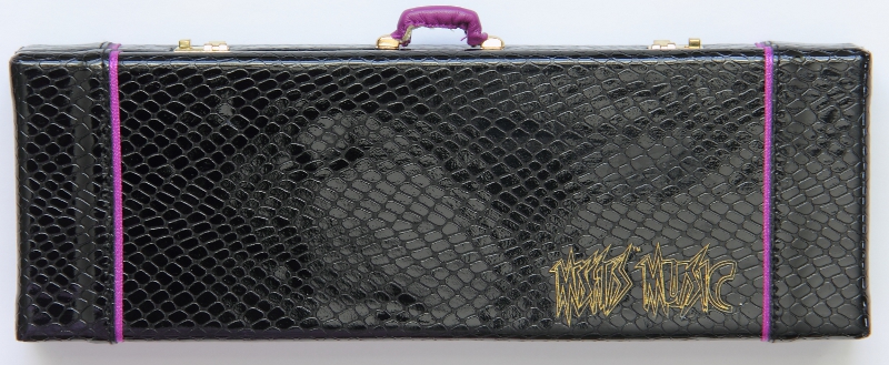 | Guitar Case: An amazingly detailed case, with leather-look handle, tiny functional clasps, and snake-skin textured black vinyl covering with the Misfits Music logo, trimmed with purple satin. Inside is lined with felt, contoured to fit a guitar; the opposite side has elasticized mesh pockets. |