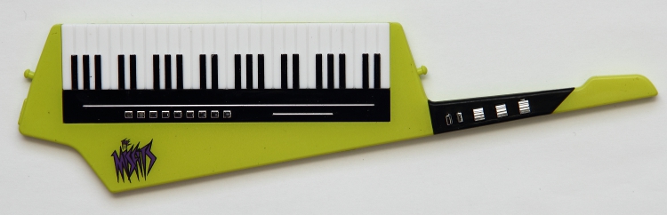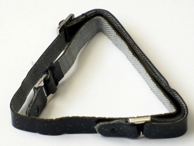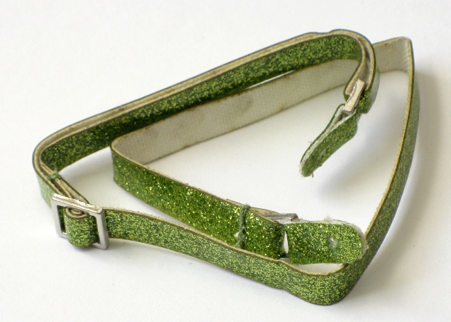 | Guitar Strap (green): Adjustable glittery greenish leatherette with chrome buckle. Came wrapped around a piece of black card stock.
