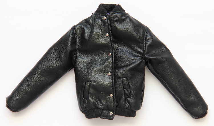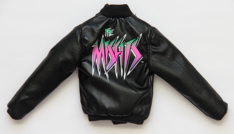Leather jacket: black leatherette bomber-style jacket with ribbed black cuffs and collar. The back has the Misfits logo. Hook and eye closures in front. Lined with purple satiny material.