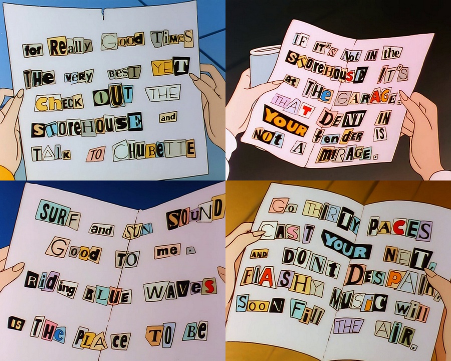 | Ransom Note: White glossy card stock. As seen in the episode In Search of the Stolen Album. WOW. Someone did their homework here. These are painstakingly similar to the screen shots from the cartoon! |