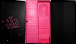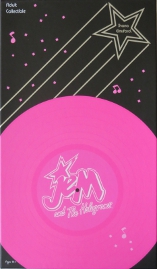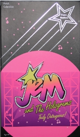 The inside of the top cover is black and has has a bright Jem logo & confetti/music notes design printed on the inside. The inner part of the back of the box is undecorated black. The doll display area is hot pink. |