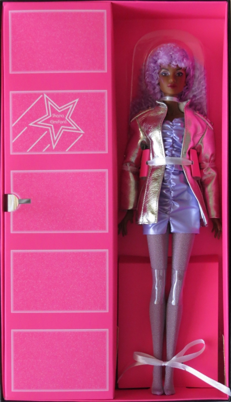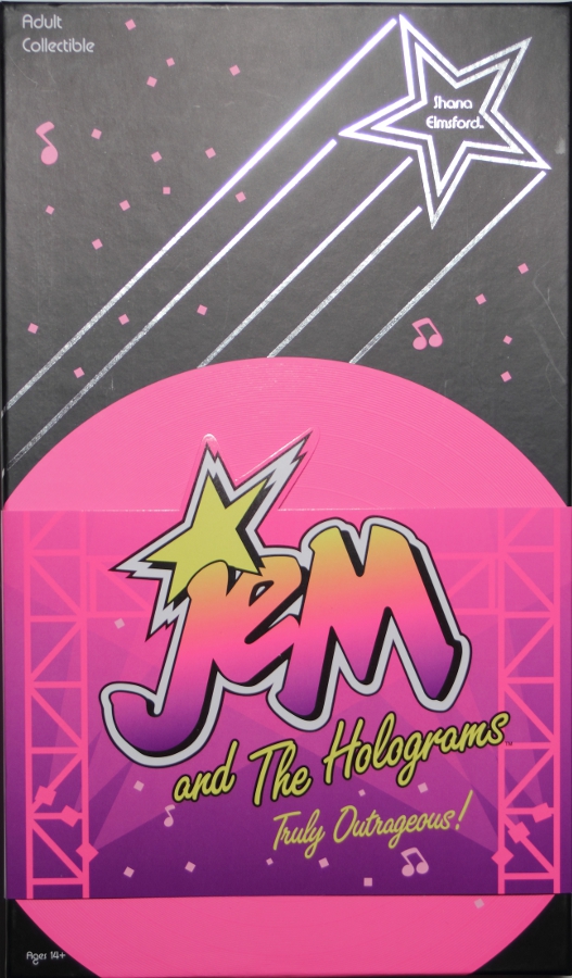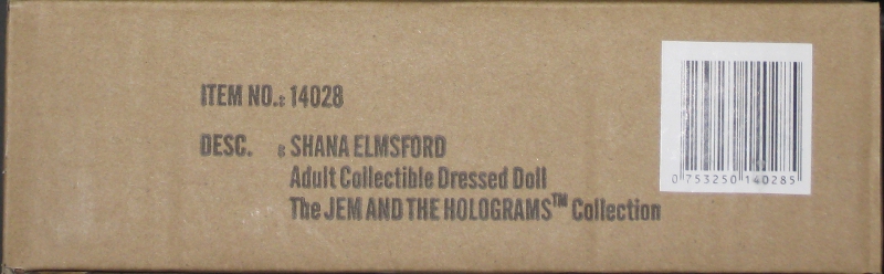 Shipper: A plain cardboard box with some printing on the bottom reading ITEM NO.: 14028/DESC.:SHANA ELMSFORD/Adult Collectible Dressed Doll/The JEM AND THE HOLOGRAMSTM Collection. The doll box was wrapped in clear cellophane bag. |