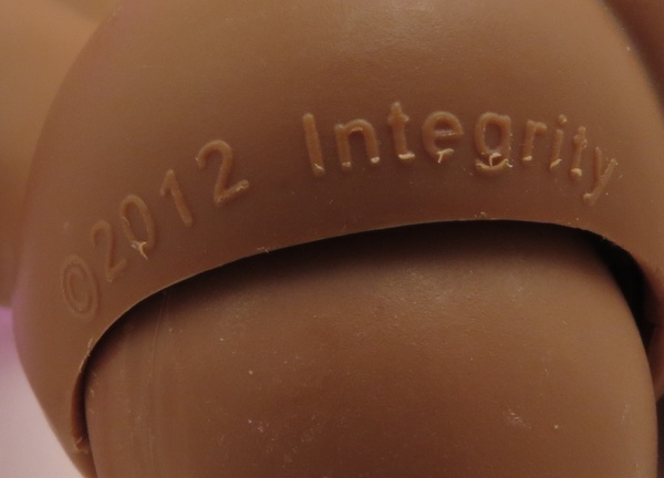 ![]() | She has an articulated smooth vinyl body that can hold many poses. She comes with two pairs of hands. She is marked ©2012 Integrity on her rear. View of back.